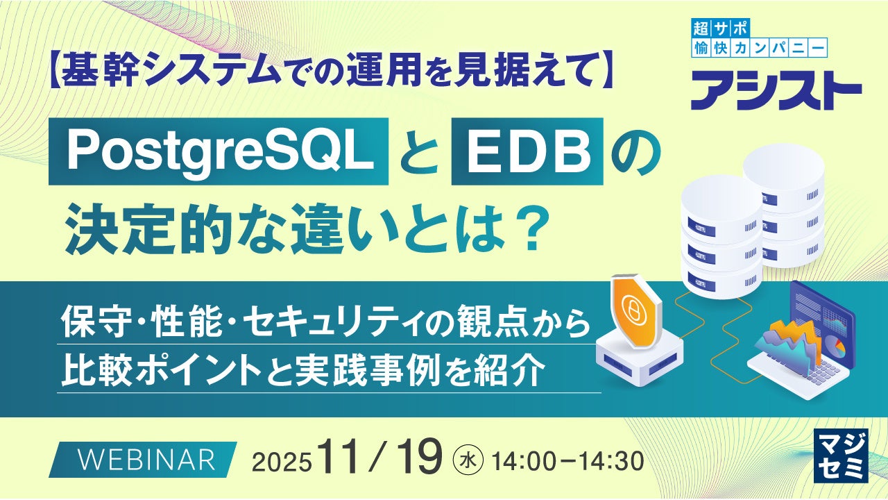 ・本セミナーは、アシストが過去に開催した「なぜPostgreSQLではなくEDBが選ばれるのか?〜事例からみるEDBによる課題解決ポイント〜」と同一内容のセミナーとなります。