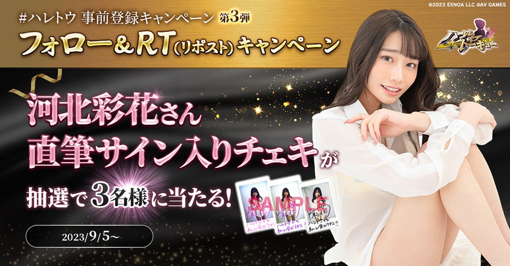 人気セクシー女優の河北彩花さんとのコラボレーション記念として、ゲーム内に登場する衣装を着用した河北さんサイン入りチェキが抽選で3名様に当たるキャンペーンを実施中です。