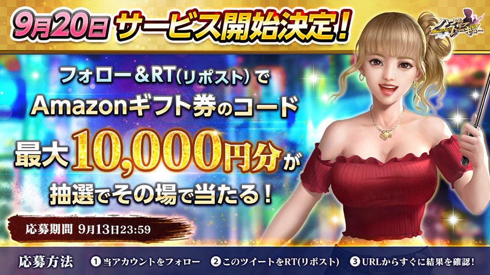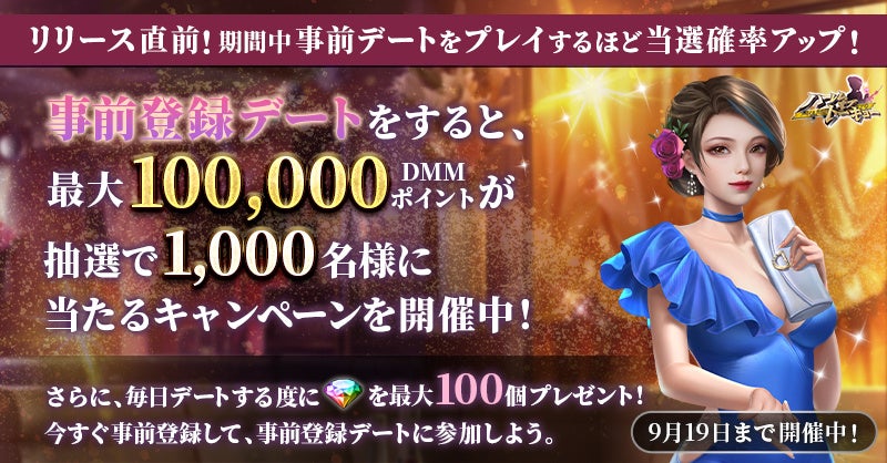 また、リリース日決定を記念し、各種Twitterキャンペーンやリリース日までの期間限定で最大10万DMMポイントをゲットできる事前登録デートの報酬が倍になるキャンペーンを実施いたします。