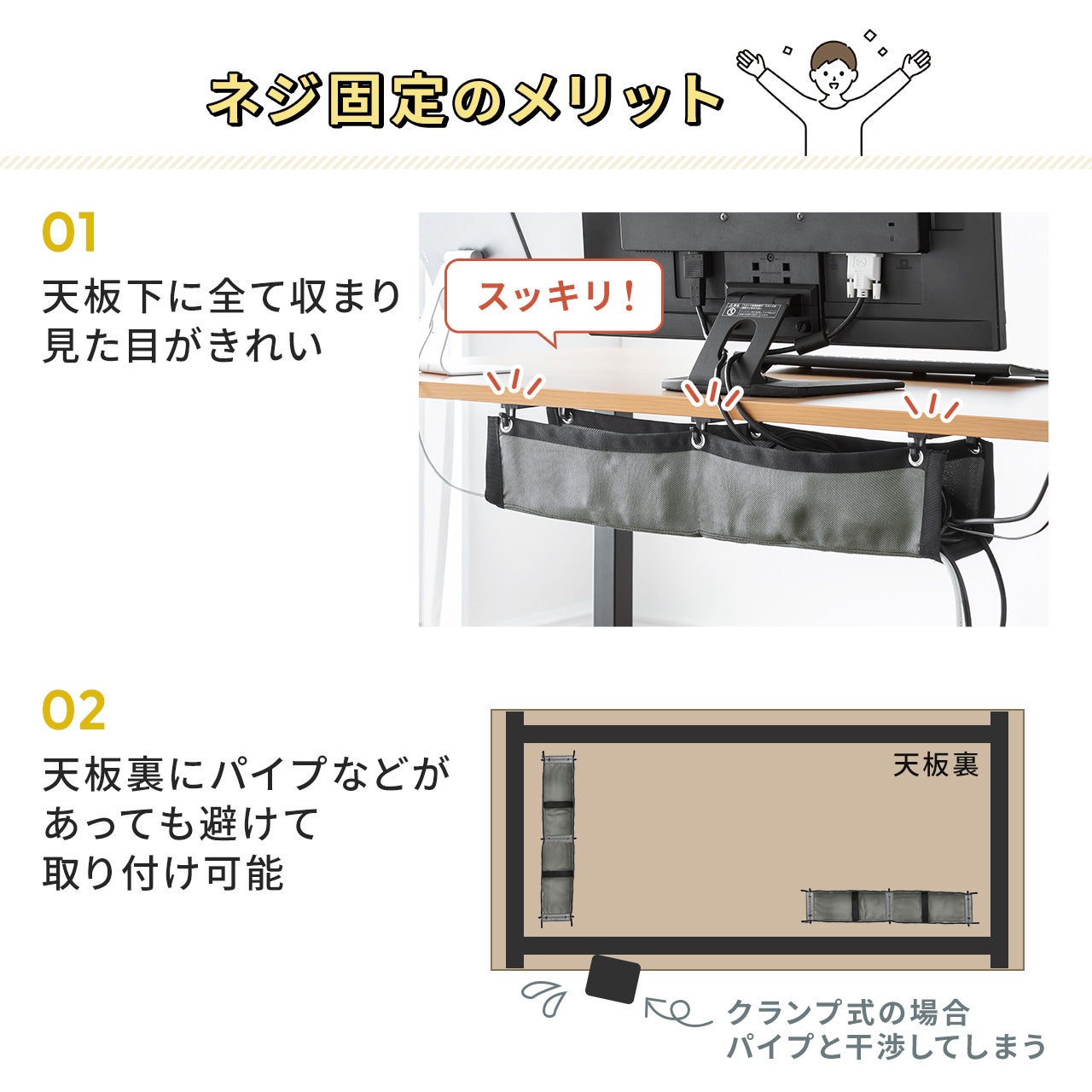 ネジで天板裏に取り付けるデスク固定式です。