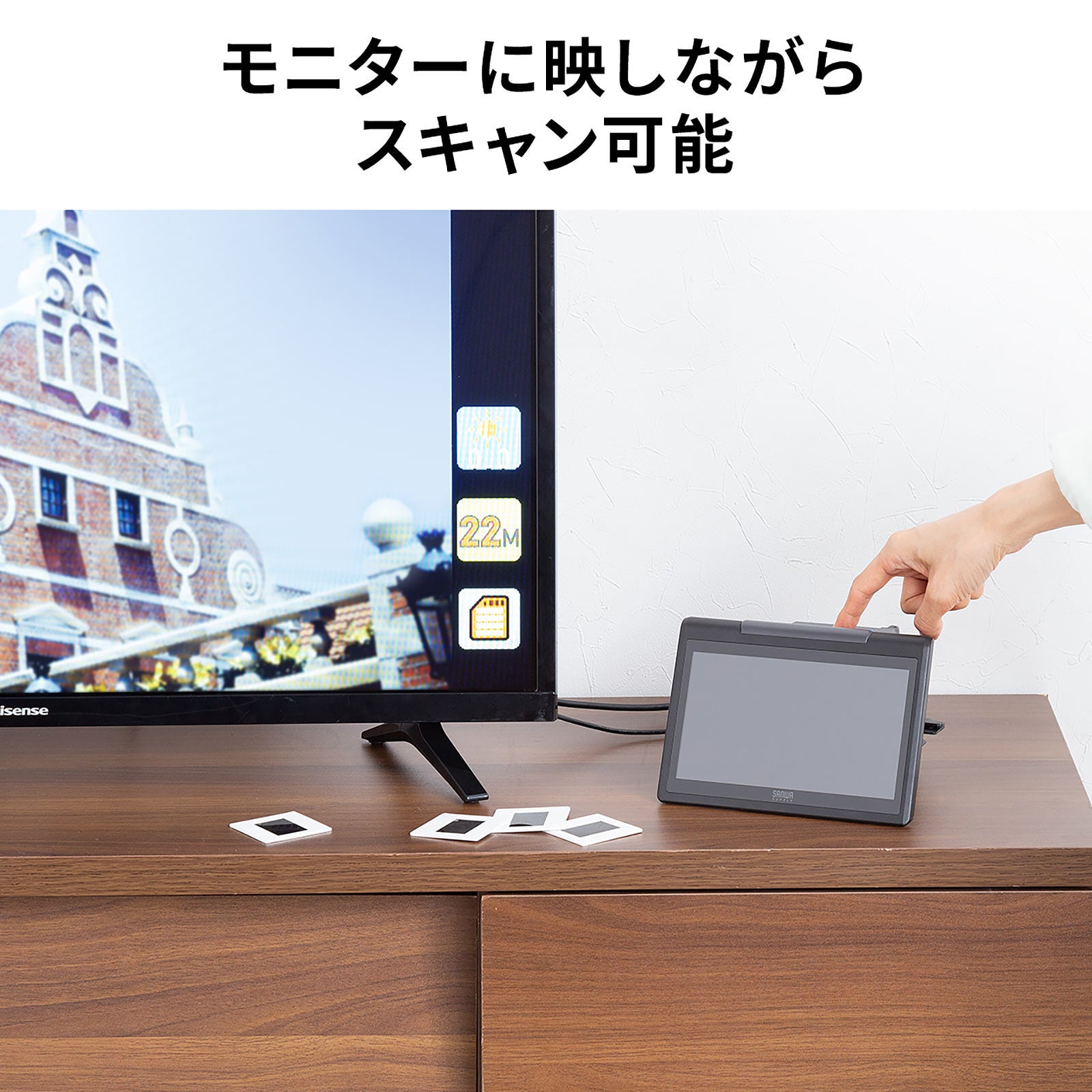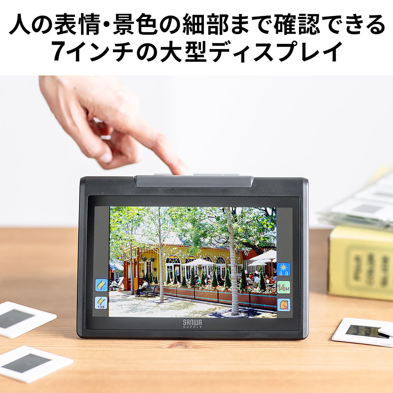 本製品は、現像したフィルムをスキャンして、簡単にデジタル化できるフィルムスキャナーです。7インチの大画面モニター付きで、スキャンの内容を確認しながら操作が可能です。1枚あたり約4秒で高速スキャンできるので、大量のフィルムをデジタル保存できます。フィルムをスキャンしデータ化すれば、劣化することなく保存ができます。