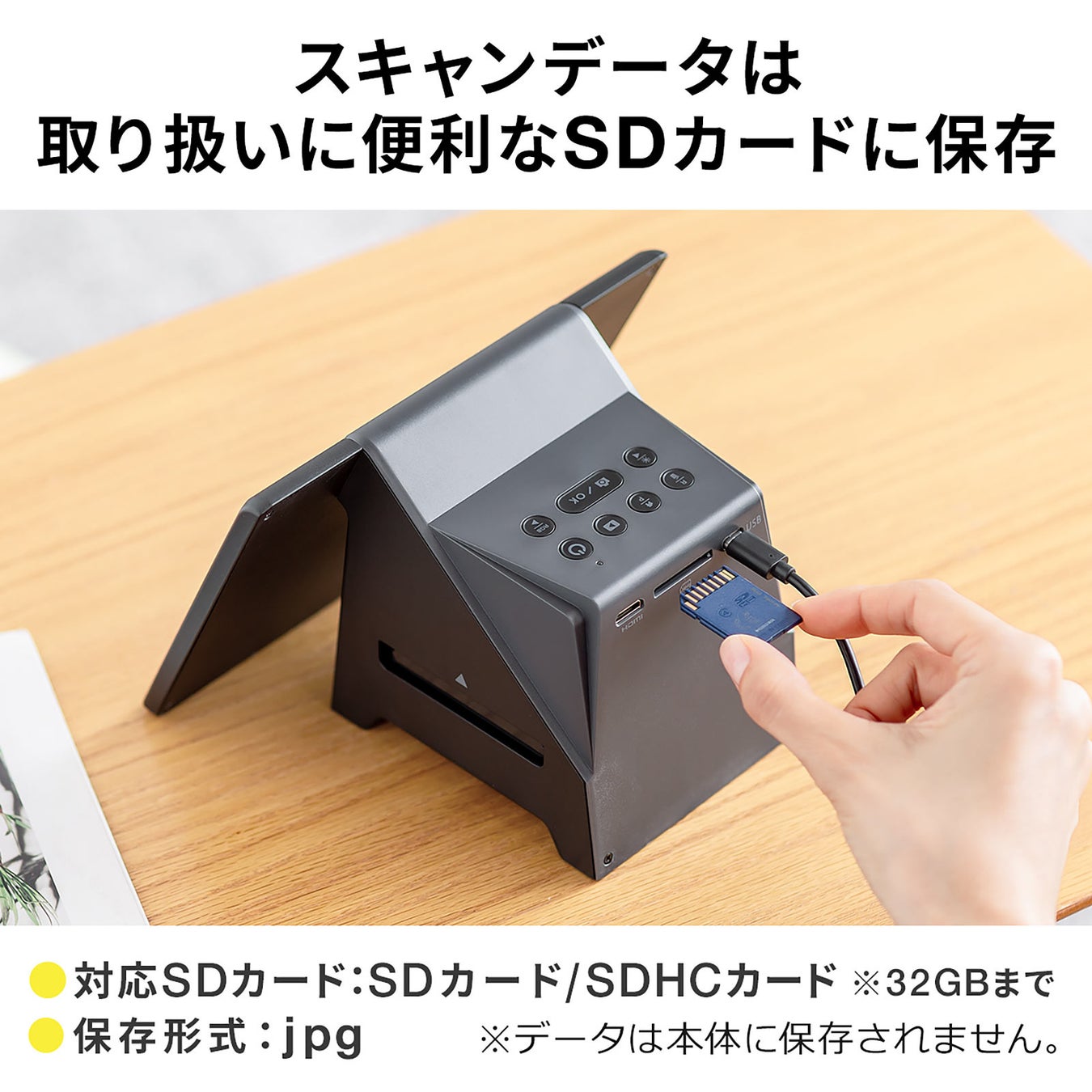 スキャンした画像データは、パソコン・ソフト不要でSDカードに直接保存できます。35mm、110、126フィルム、スライドフィルムと様々なフィルムに対応しています。