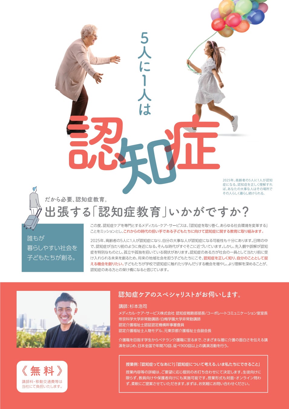 株式会社 学研ホールディングス(東京・品川/代表取締役社長:宮原博昭)のグループ会社、メディカル・ケア・サービス株式会社(埼玉・さいたま市/代表取締役社長:山本教雄)は、「認知症を取り巻く、あらゆる社会環境を変革する」ことを企業ミッションとし、学校を対象とした「認知症教育」を開始します。第一弾として9月より、埼玉県さいたま市の小・中・高等学校向けに募集を開始し、希望のある学校に対して順次実施します。