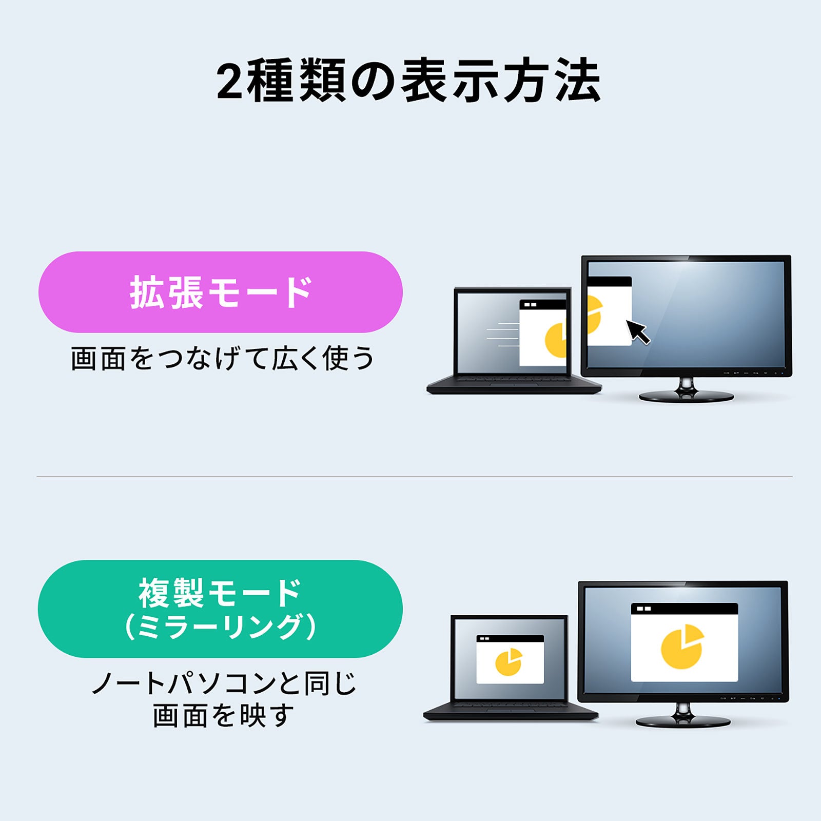 USB Type-C接続でのディスプレイ出力「DisplayPort Alt Mode」に対応し、ソフトウェアのインストールなしで簡単にマルチディスプレイ環境(ミラーモード/拡張モード)を実現できます。
