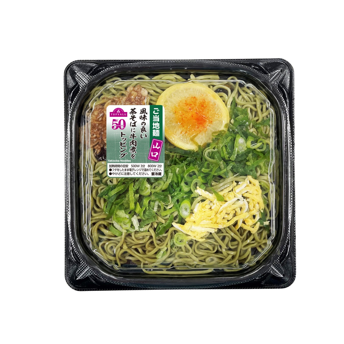 特長:風味のよい茶そばに牛肉煮をトッピングしました。山口県のご当地メニューです。