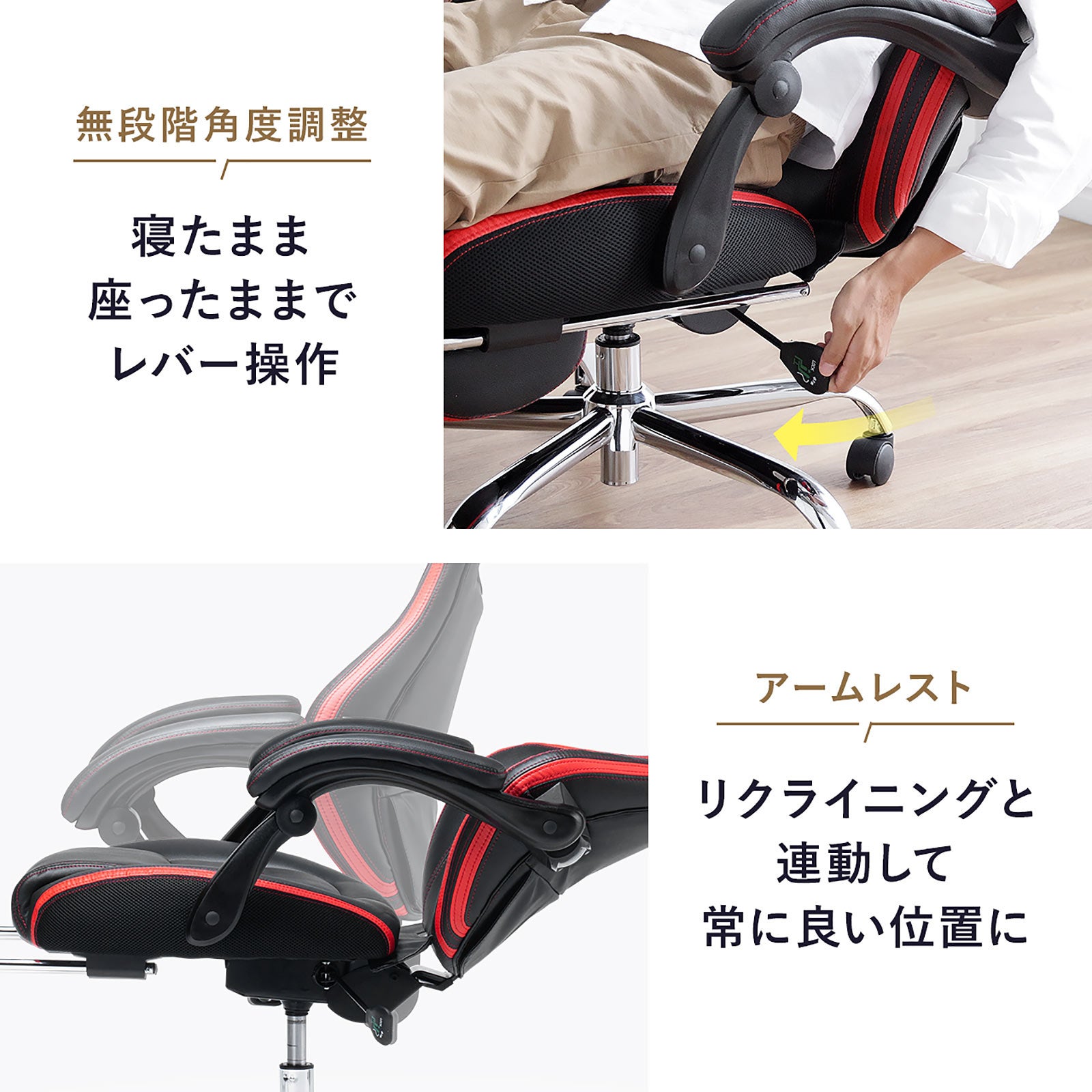 本製品は、170度リクライニングで寝られるゲーミングチェアです。座面下のレバーを引くだけで容易にリクライニングさせる事が出来ます。