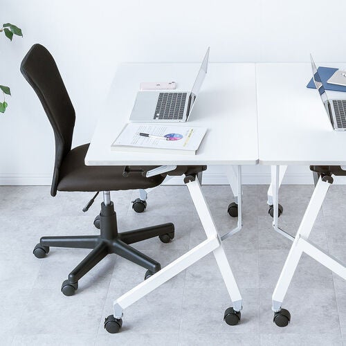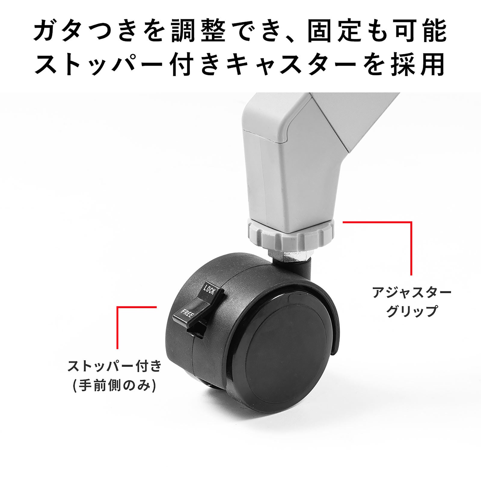 キャスター付きで簡単に移動ができるので、楽に収納したり、レイアウト変更や複数台を並べて設置したりすることができます。手前側2つのキャスターにはストッパーが付いているので、作業中は足を固定することが可能です。