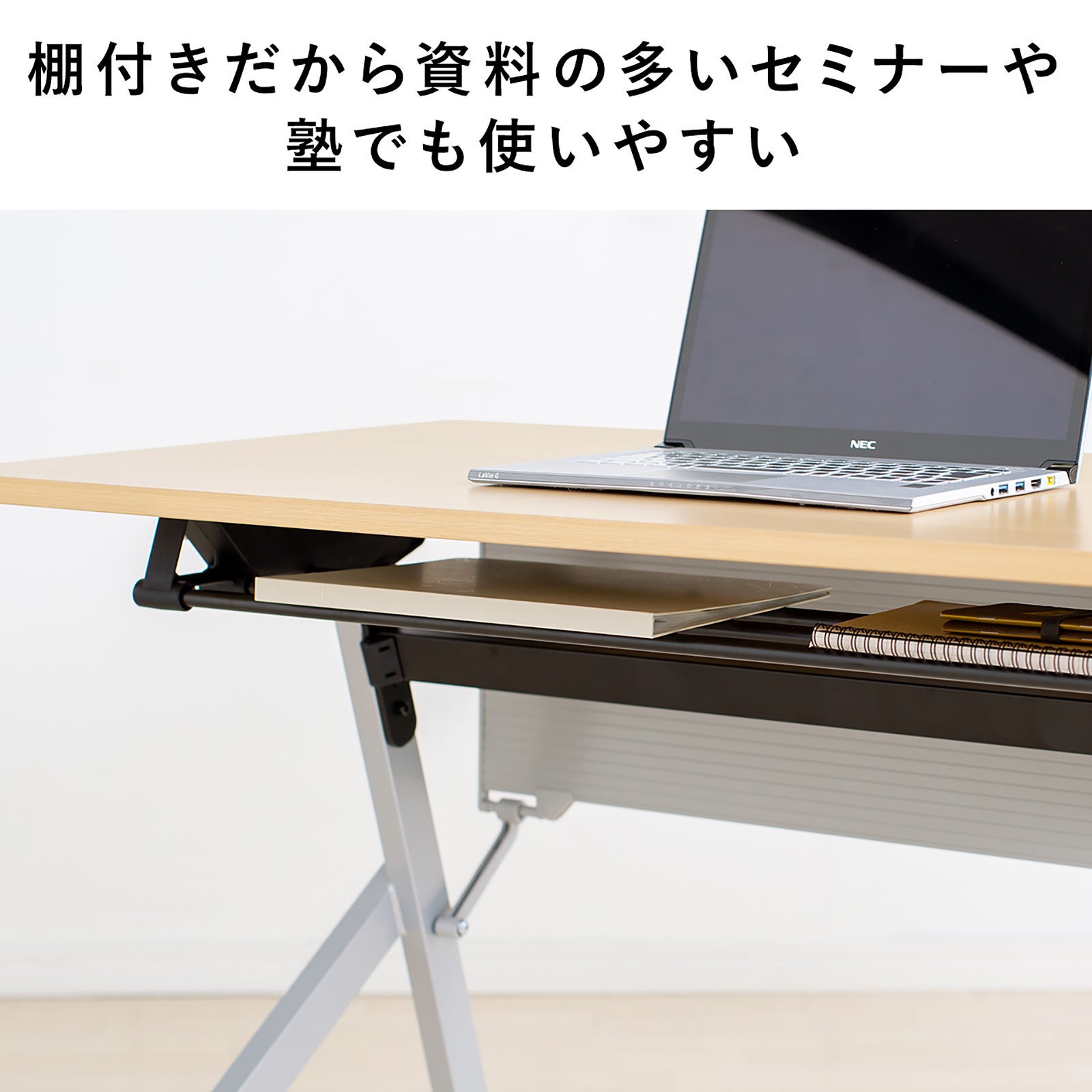 天板表面はメラミン化粧板なので、水や飲み物などをこぼしてしまっても簡単に拭き取ることができます。天板下に棚があるので、ノートや資料などをしまうことができます。