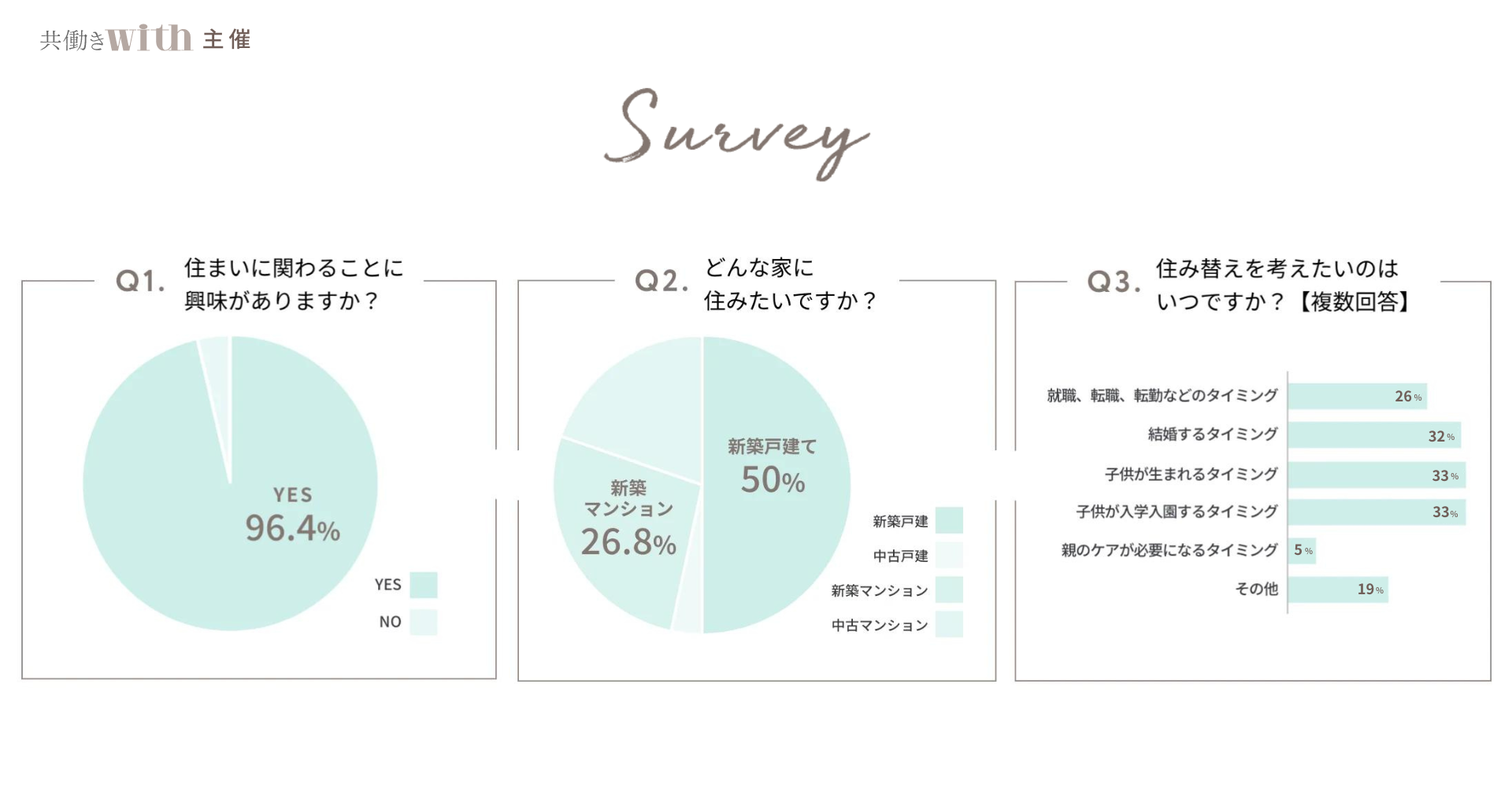都心のマンションの高騰などもあり、より賢く、主体的に理想の住まいを選び取るために「知識を身につけたい」という声が、結婚、出産を経て住み替えの必要性に直面した共働きwithの読者コミュニティ内から自発的に上がりました。そこで、編集部では事前調査を行い96%の読者の「住まいについて学びたい」という高い支持を得てこの学びのプロジェクトがスタートしました。