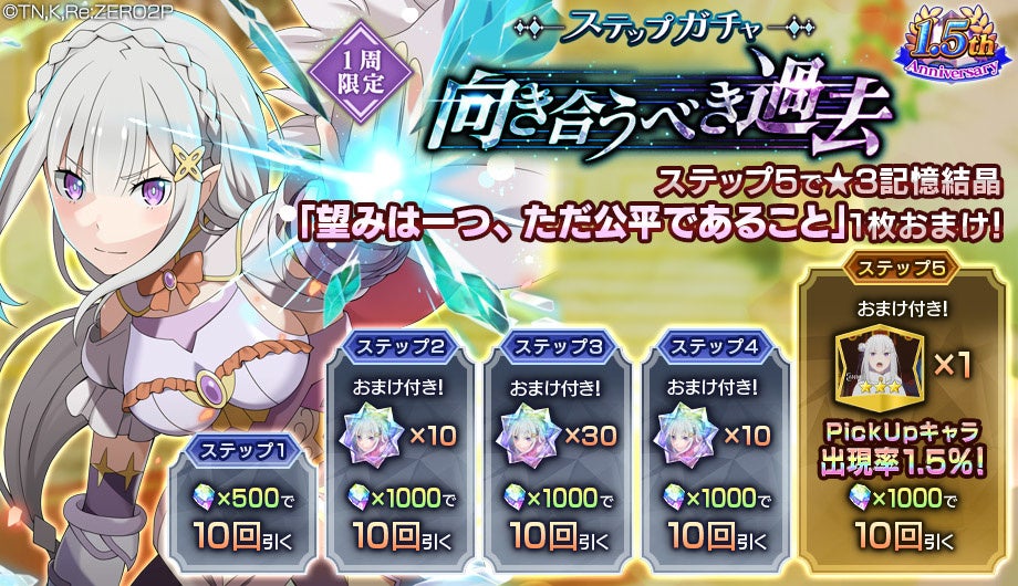 ステップ1では「魔法石500個」で10回ガチャを引くことができ、ステップ2・3・4では「【向き合うべき過去】のかけら」、ステップ5ではピックアップキャラの出現率が1.5%&記憶結晶「望みは一つ、ただ公平であること★3」のおまけ付きのお得なガチャです。