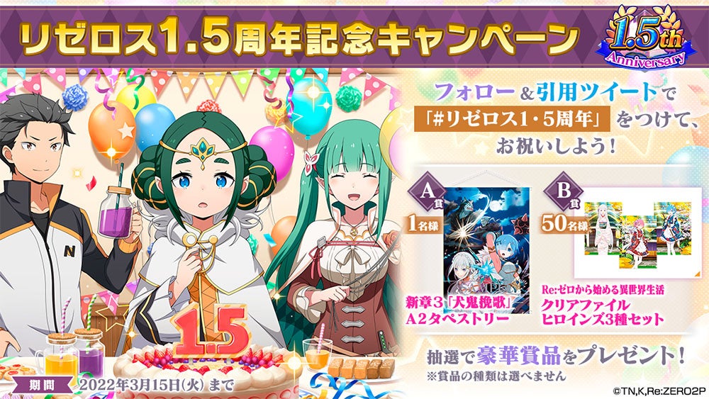 内容:『リゼロス』公式Twitter(https://twitter.com/re_zero_rezelos)をフォロー&ハッシュタグ「#リゼロス1.5周年」をつけてキャンペーンツイートを引用RTすると、抽選で「新章3「犬鬼挽歌」A2タペストリー」を1名様、「『Re:ゼロから始める異世界生活』クリアファイル ヒロインズ3種セット」を50名様にプレゼントするキャンペーンを開催します。