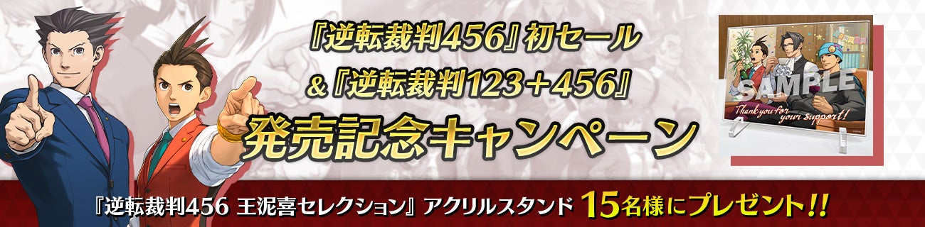 『逆転裁判456 王泥喜セレクション』の初セールおよび『逆転裁判123+456 コレクション』の発売を記念して、『逆転裁判456 王泥喜セレクション』アクリルスタンドが抽選で当たるキャンペーンを開催。