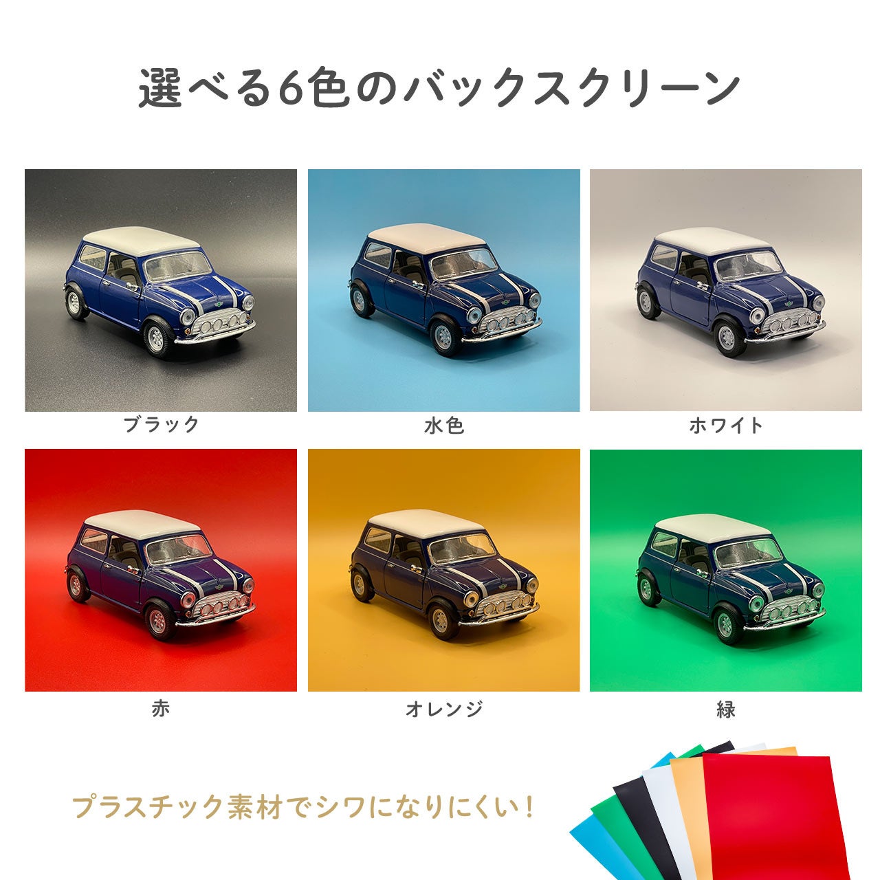 バックスクリーンは豊富な6色(ブラック、水色、ホワイト、赤、オレンジ、緑 各1枚ずつ)入りで、シワになりにくいプラスチック素材です。