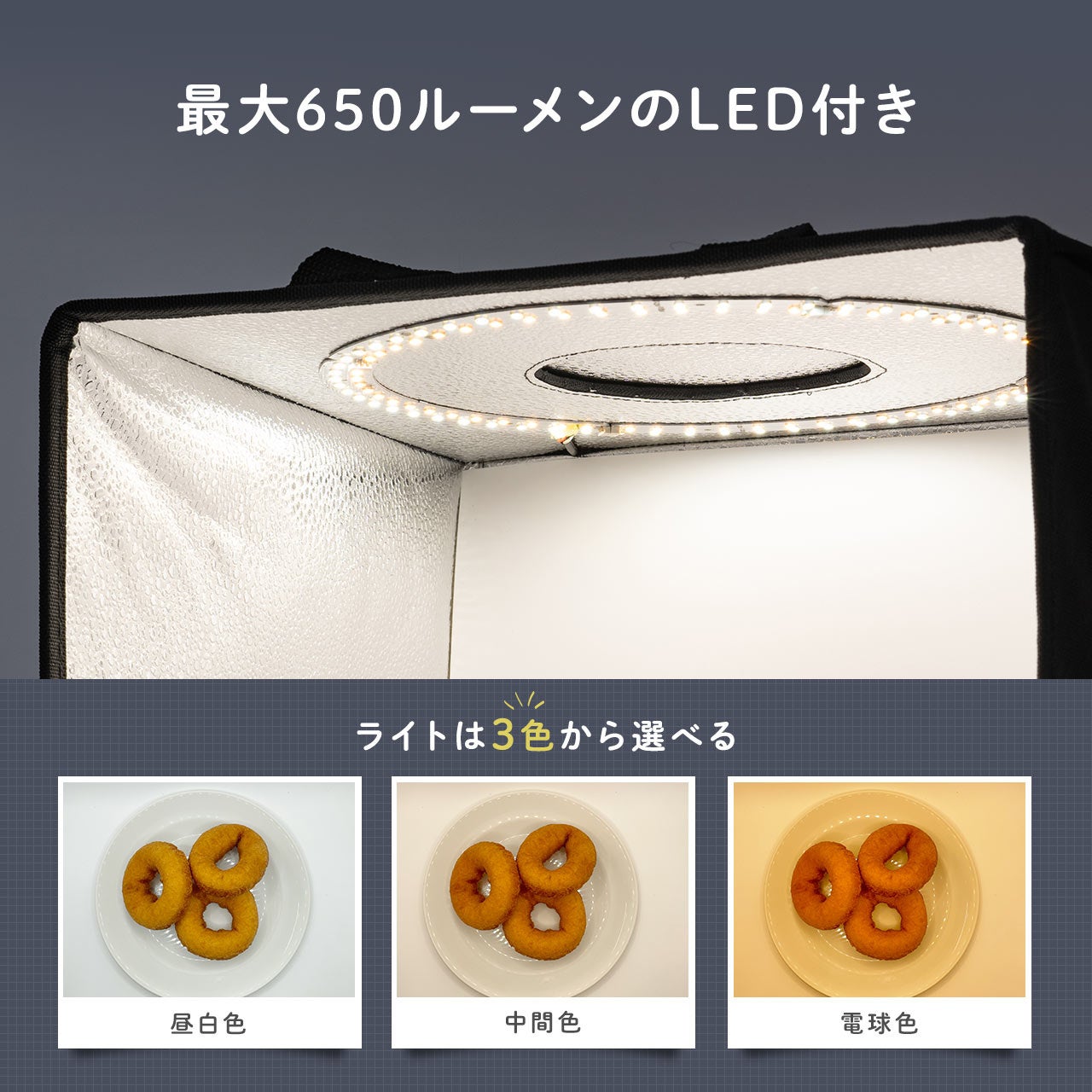 撮影スペースは、約30cm四方です。最大650ルーメンの明るく照らすLEDライト付きです。