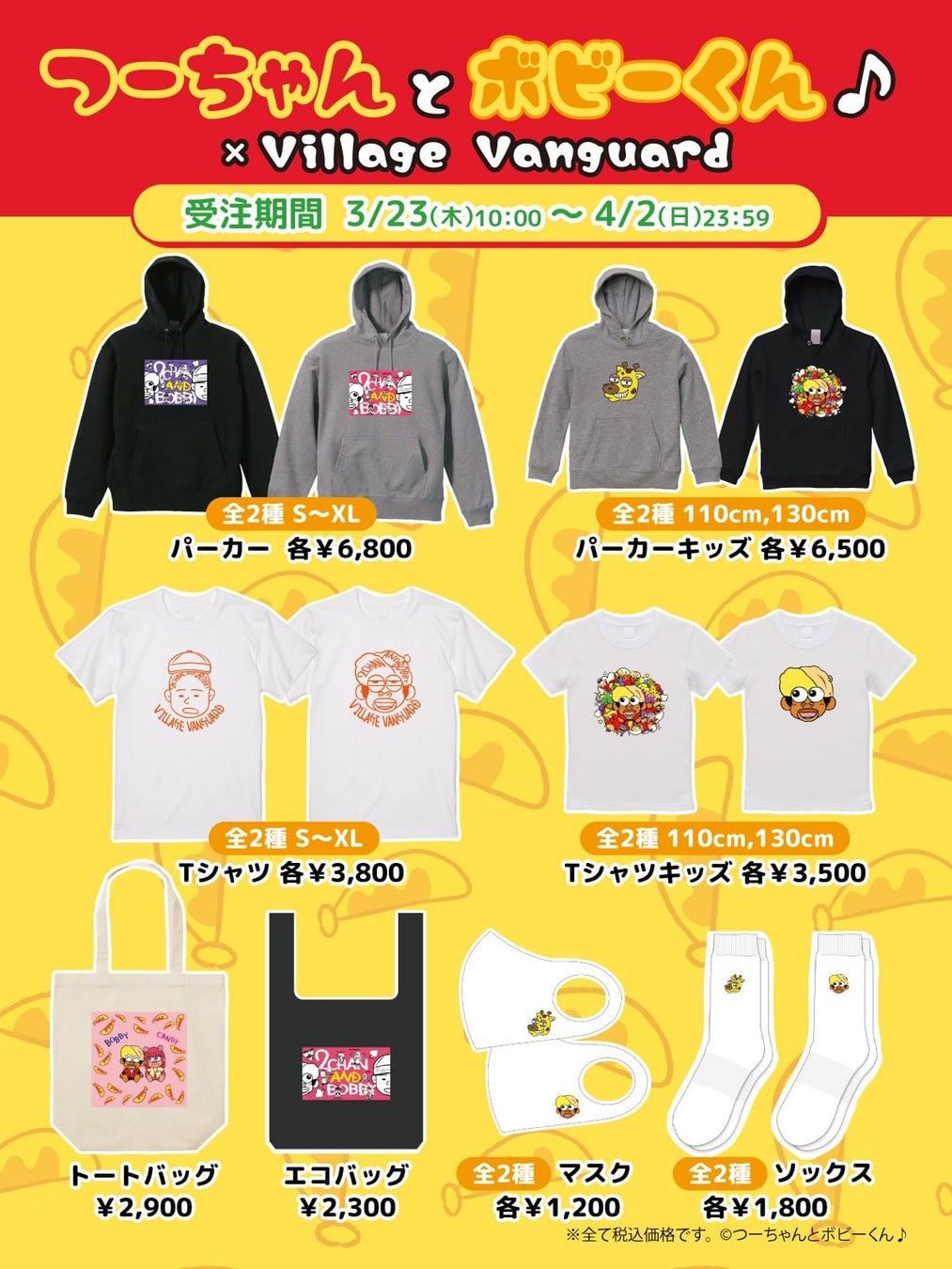 2023年3月23日(木)より、ファミリーみんなで楽しめるYouTubeチャンネル【つーちゃんとボビーくん♪】のヴィレッジヴァンガード限定グッズがオンラインストアにて発売決定!!なんと今回のコラボの為に描き下ろしデザインのTシャツもあり!親子で揃えたくなっちゃうたくさんのグッズが出来ました!期間限定のオンライン受注販売のみになりますのでお見逃しなく!
