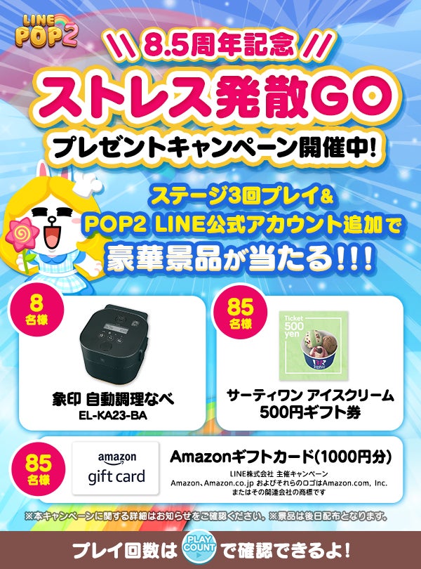 期間中、全ステージの中から3回プレイして「LINE POP2」公式LINEアカウントを友だち登録すると、抽選で象印自動調理なべやサーティーワンアイスクリーム500円ギフト券、Amazonギフトカード1,000円分が当たるキャンペーンを開催します。奮ってご参加ください。