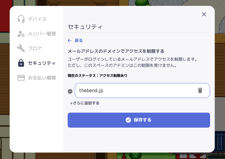 ご利用中のスペースに「アクセスを許可するドメイン」を設定することで、そのドメイン以外のメールアドレスでサインインしているユーザーはスペースに入ることができなくなります。ドメインは複数個設定することも可能です。