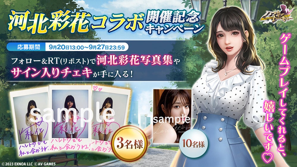 また、サービス開始記念で全員もらえる大量のゲーム内アイテムプレゼントや、人気セクシー女優の河北彩花さんの写真集やサイン入りチェキが抽選で当たる豪華Twitterキャンペーンを実施いたします。