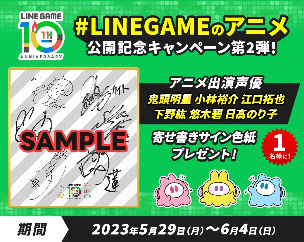 本日、その「LINE GAME10周年」アニメーションのサイドストーリー第2弾『ハートを送りあう会』を公開しました。さらに「LINE GAME」公式Twitterでは、出演声優の寄せ書きサイン色紙が当たるTwitterキャンペーンを開始するほか、5月30日(火)、31日(水)には出演声優の録りおろしボイス付きアニメイラストを公開予定です。