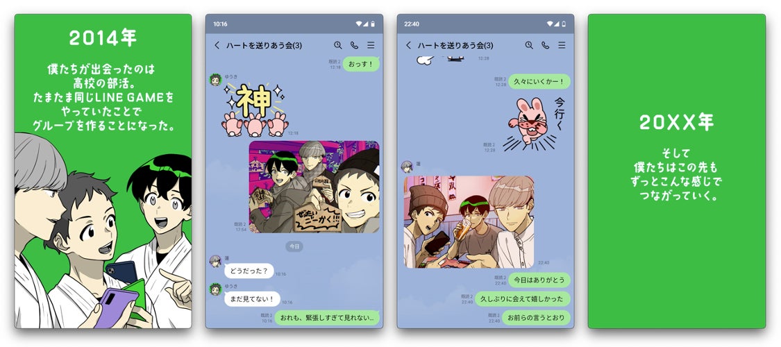 本日公開されたサイドストーリー第2弾『ハートを送りあう会』は、「LINE GAME」を通じて仲良くなったカイト(CV. 小林裕介)、ゆうき(CV. 下野紘)、蓮(CV. 江口拓也)の3人が高校生から大人になっていくまでのストーリーを、「LINE」のやりとりで描いた作品です。