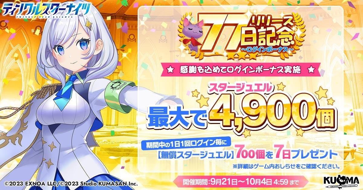 リリース77日を記念して、最大でなんと4,900個の無償スタージュエルがもらえるログインボーナスを用意しました!