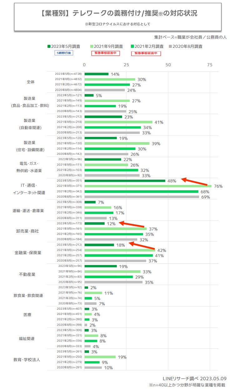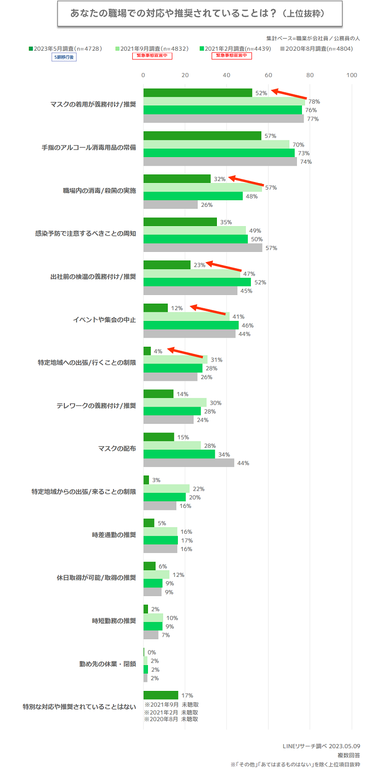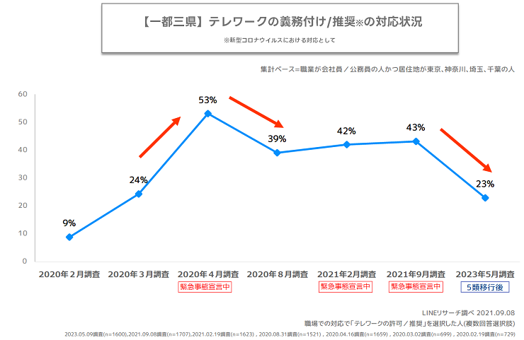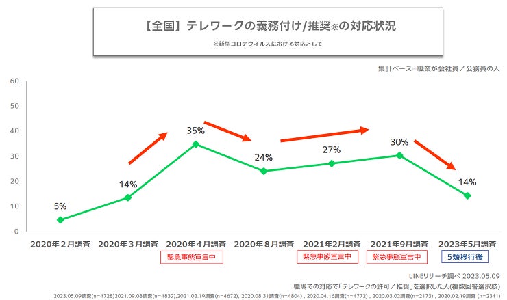 【LINEリサーチ】新型コロナウイルスの5類移行は9割以上の人が認知している結果に 「テレワークの義務付け/推奨」を行っている職場の割合は大きく減少し1割台