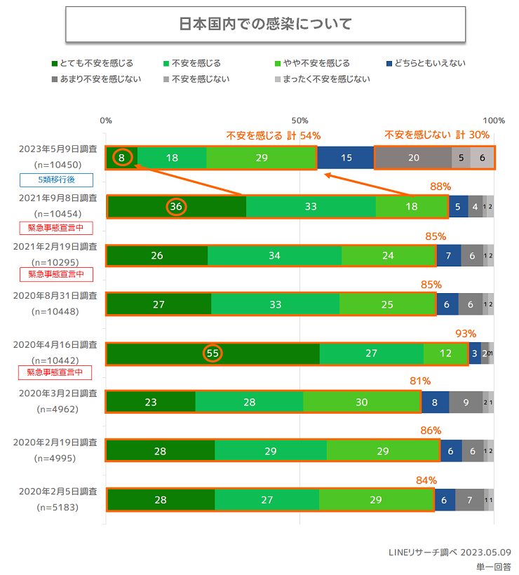 ※《「5類感染症」に移行したことを知っていますか?》の設問の前に聴取しているため、この設問による上記不安度の結果への影響はありません。