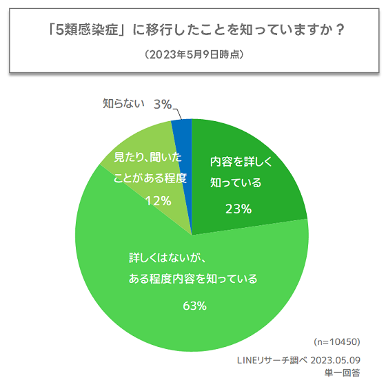 2023年5月8日に、新型コロナウイルスの感染法上の分類が「5類」に引き下がったことについて、知っているかどうか聞きました。(2023年5月9日調査時点)