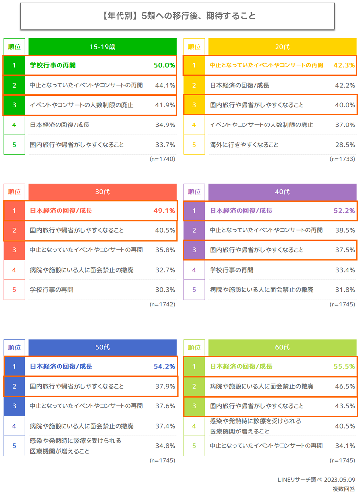 ■5類移行後に期待することは「日本経済の回復/成長」が最も高い結果に。10代では「学校行事の再開」が1位