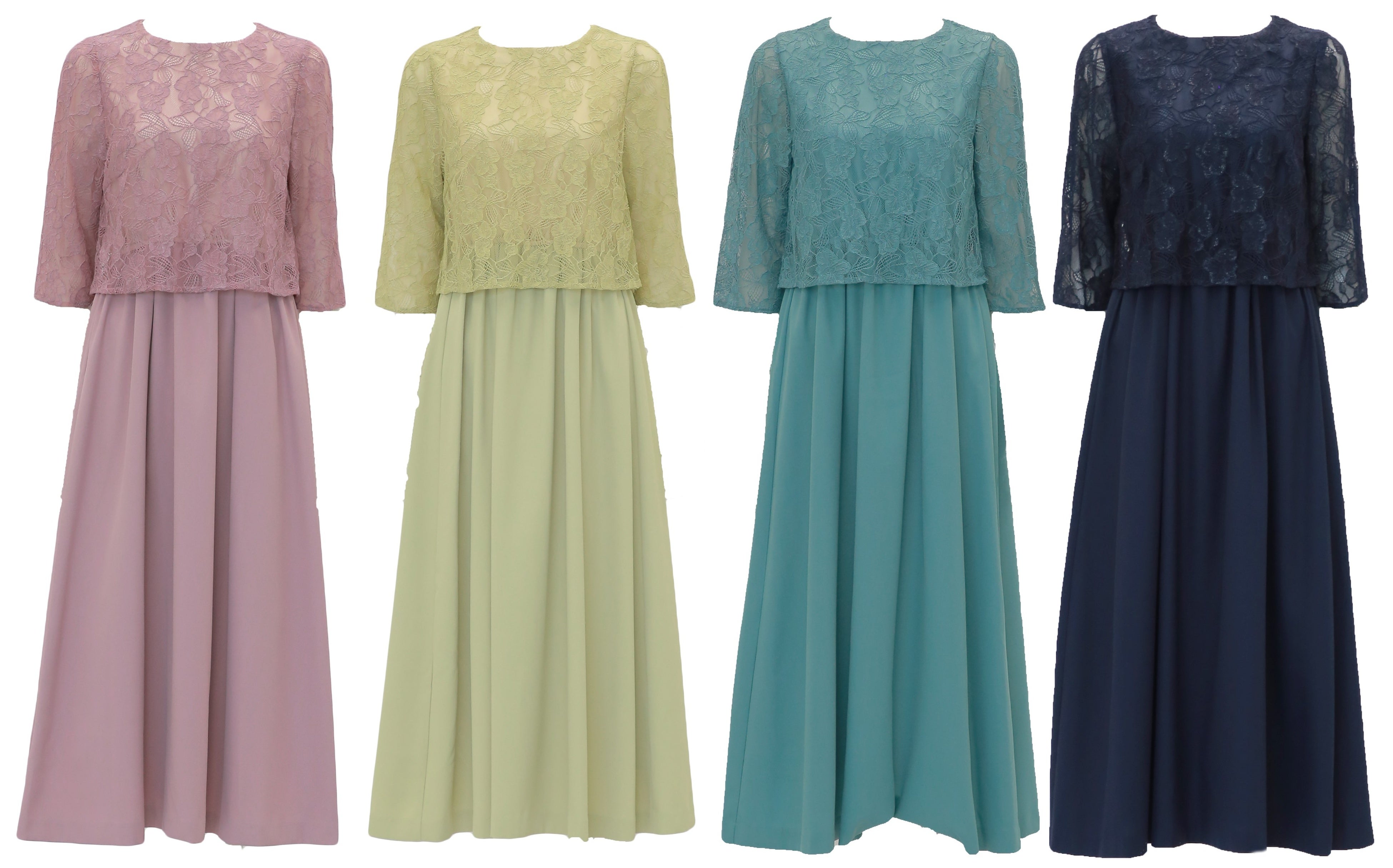 トップスは様々な体型のお客さまにもフィットする「かぶせデザイン」を採用し、袖は肘まである5分丈で二の腕をカバーします。スカート部分はハリ感のある生地を使用し、優雅さとエレガントさを演出します。ウエストはゴムで着心地にもこだわりました。結婚式や、卒業式・成人式の二次会などにおすすめです。