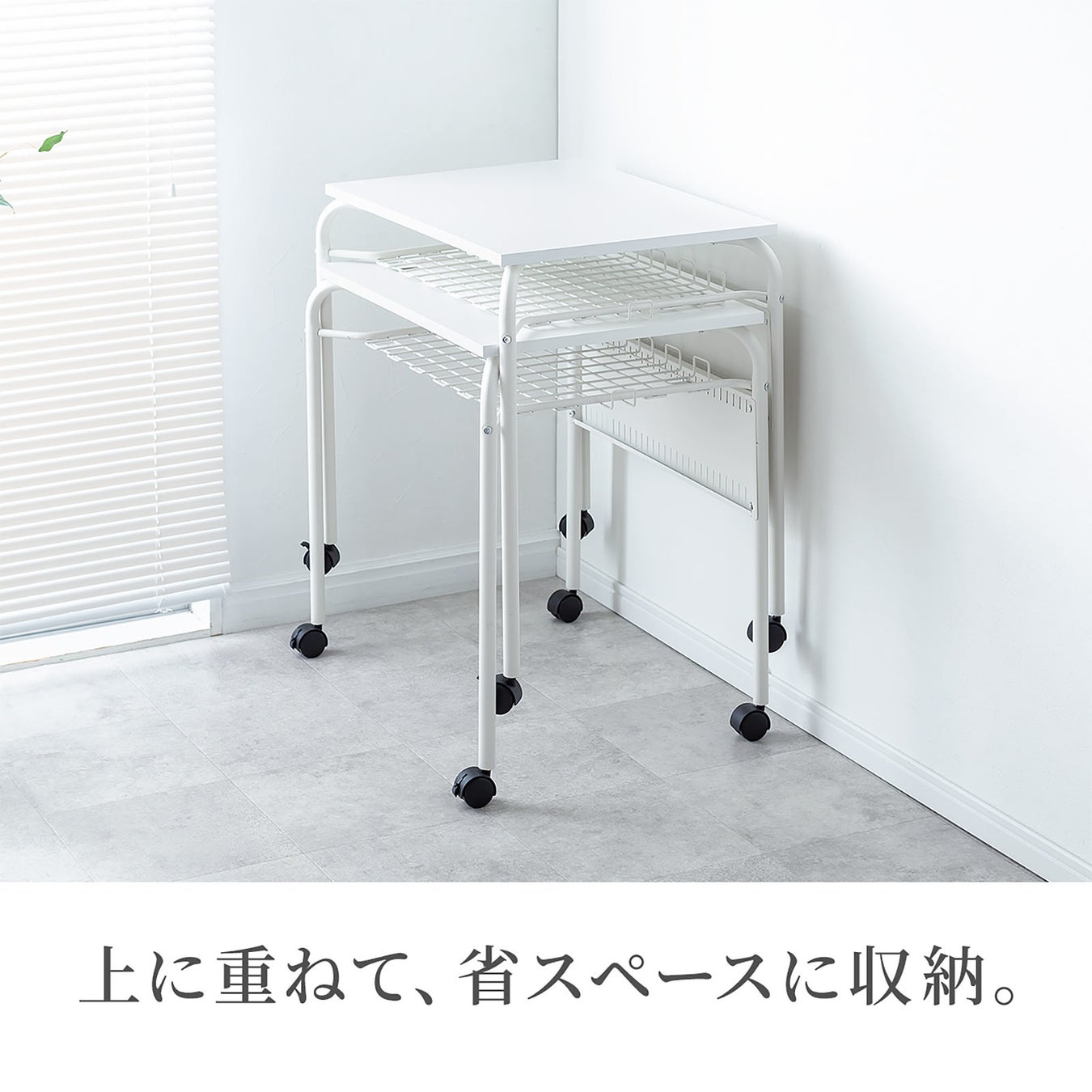 本製品は、重ねて省スペースに収納できるスタッキングデスクです。最大2台まで上に重ねて省スペースに収納することができます。