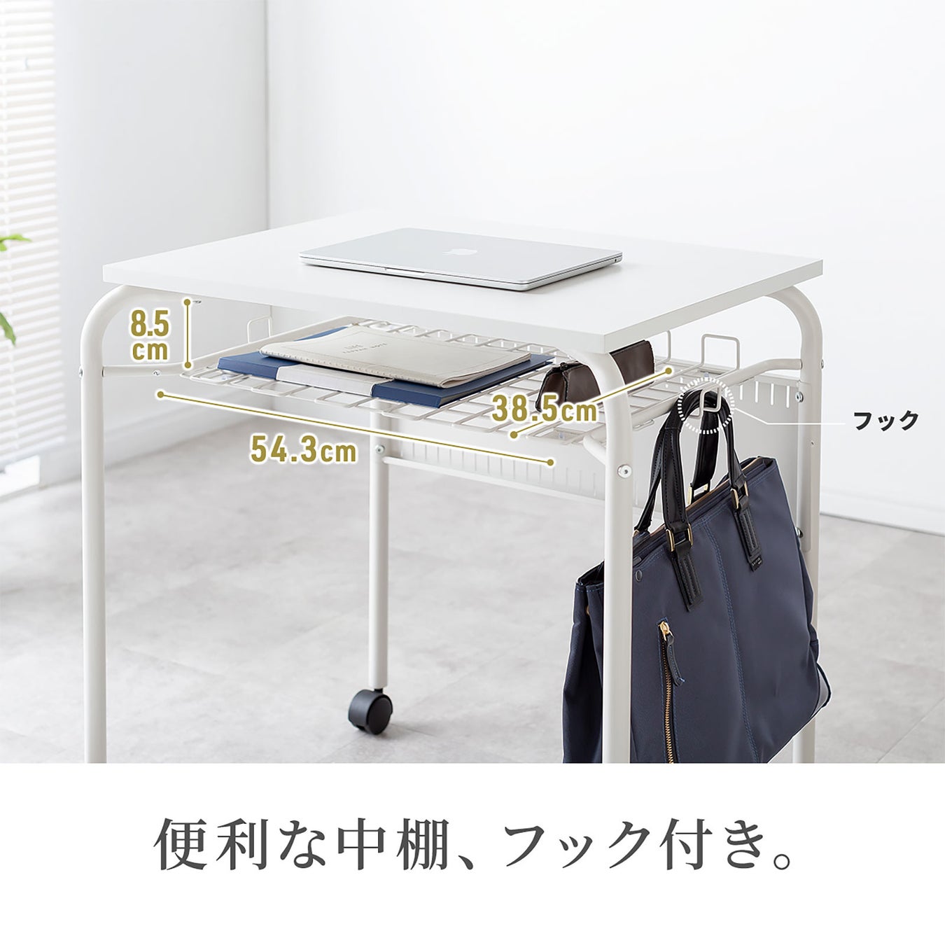 収納に便利な中棚、フック付きで、天板下を有効に活用できます。