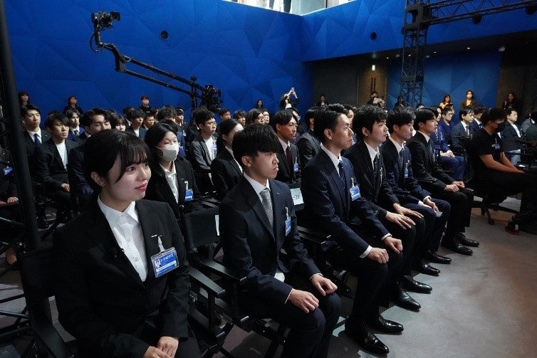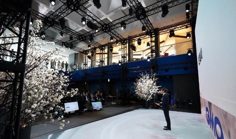 2024年3月1日(金)に「GMOインターネットTOWER」(東京都世田谷区用賀)にグランドオープンした、リアルとバーチャルが融合したハイブリッド型イベントスペース「GMOグローバルスタジオ」で入社式を初開催しました。最先端の3DCG・VFX 技術を駆使した映像表現を取り入れています。