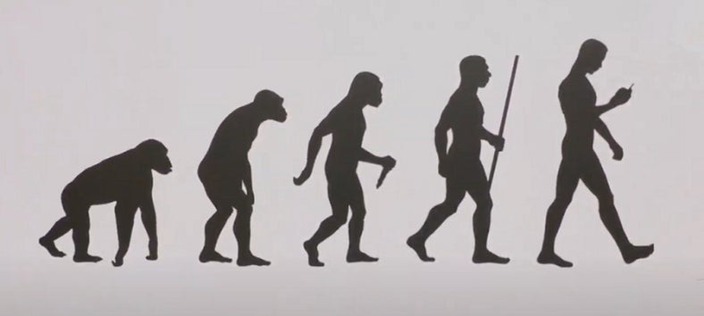 これは皆さん見覚えのある画像だと思いますが、わかる方いらっしゃいますか?ダーウィンの進化論でよく使われるイラストです。今まさにRPA・AIを使いこなす人と使わない人で猿と人間の差がつく時代になっている。RPAやAIを使わないと猿に逆戻りです。使いこなす人に駆逐される時代が来ています。RPAとかAIをフル活用できる人財(人材)に成長してもらいたい、これがお願い事です。強いものが生き残ったわけではない。賢いものが生き残ったわけでもない、今のこの変化に対応したものだけが生き残れるのです。AI・RPAに対応しないと、おそらく皆さんも我々グループも生き残れない、そう強く思っています。