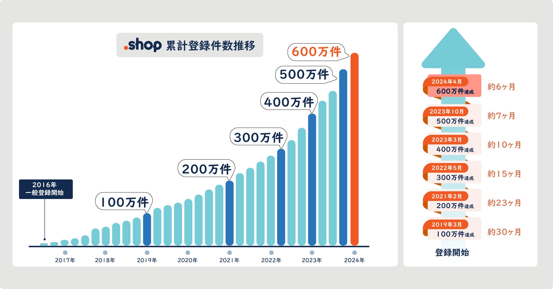 「.shop」の登録数は、世界中のEC市場の拡大とともに年々増加しています。2016年9月の一般登録開始から7年の2023年10月には、累計登録数が500万件を突破しました。その後も成長スピードは衰えず、100万件の増加スピードとしては登録開始以来最速ペースのわずか6ヶ月で、600万件を達成しました。