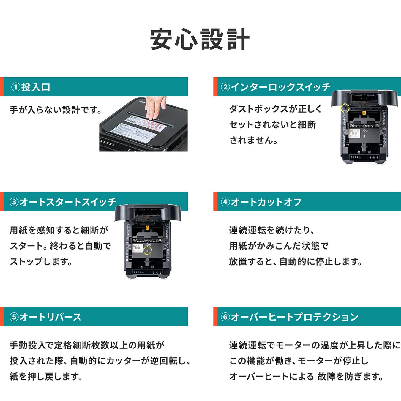 モーター保護のため、連続細断(オートフィード細断/約60分、手差し細断/約10分)を超えて細断したり、紙が噛み込んだ状態で放置すると自動的に停止するオートカットオフ機能を採用しています。