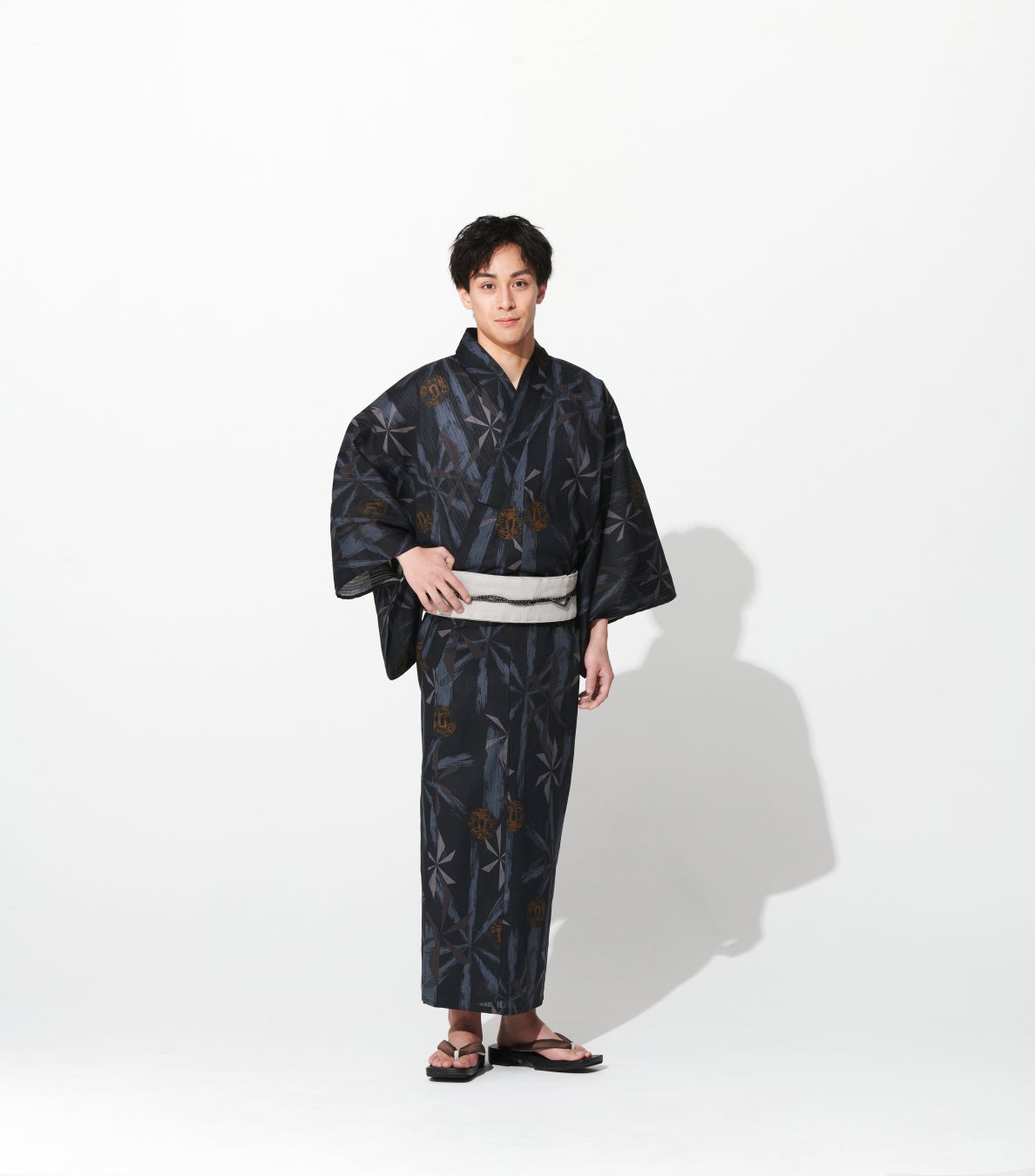 ゆかたには麻混生地を使用しています。天然繊維のもつマットな生地に古典的な筆書き調の柄を合わせています。微かな光沢のある帯とのセットで、きりりと粋なオトナ見えが叶うシリーズです。