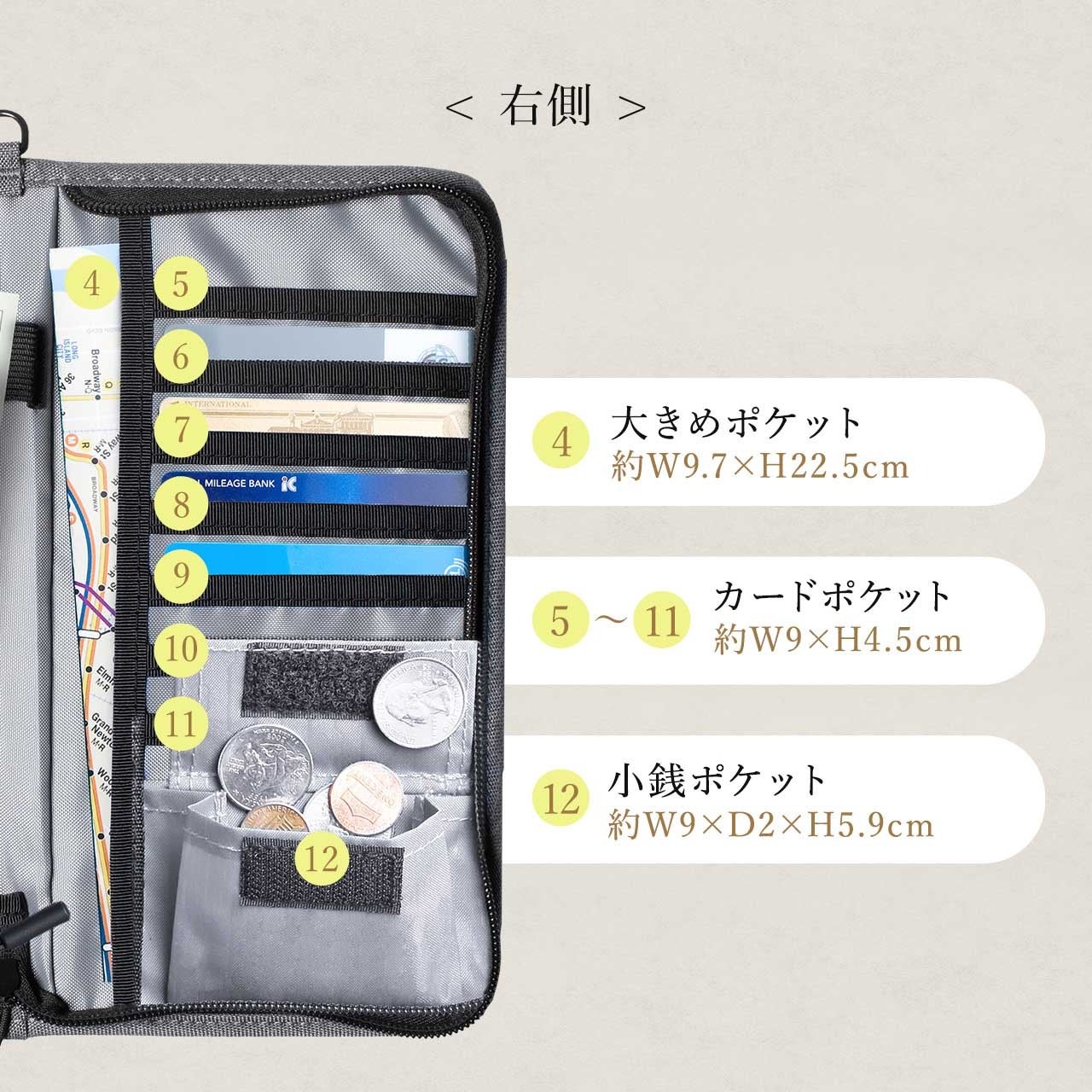 左側には、マルチ収納ポケット、パスポート用ホルダーポケット、ファスナー付ポケットを搭載しています。