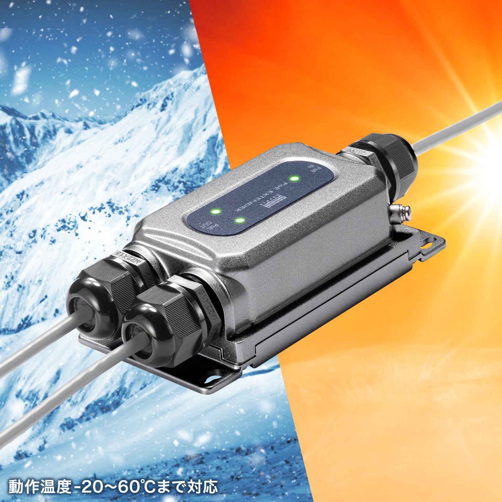 防水規格IP67と、動作温度-20〜60℃まで対応するPoEエクステンダーです。 雨で濡れたり温度変化の多い屋外でのPoE信号の伝送・延長が可能で、幅広い環境下で動作します。