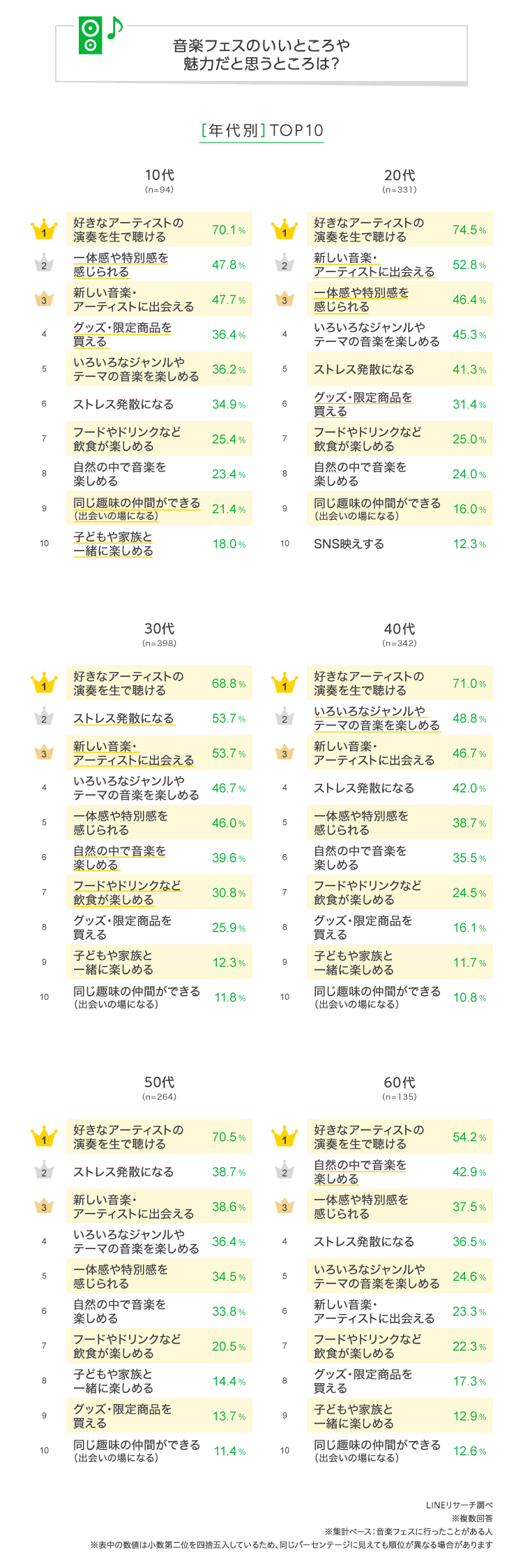 10~20代では「グッズ・限定商品を買える」の割合が3割超で、ほかの年代と比べて高くなりました。音楽フェスに行く人の割合が高かった20~40代では、「いろいろなジャンルやテーマの音楽を楽しめる」「新しい音楽・アーティストに出会える」の割合が高くなりました。