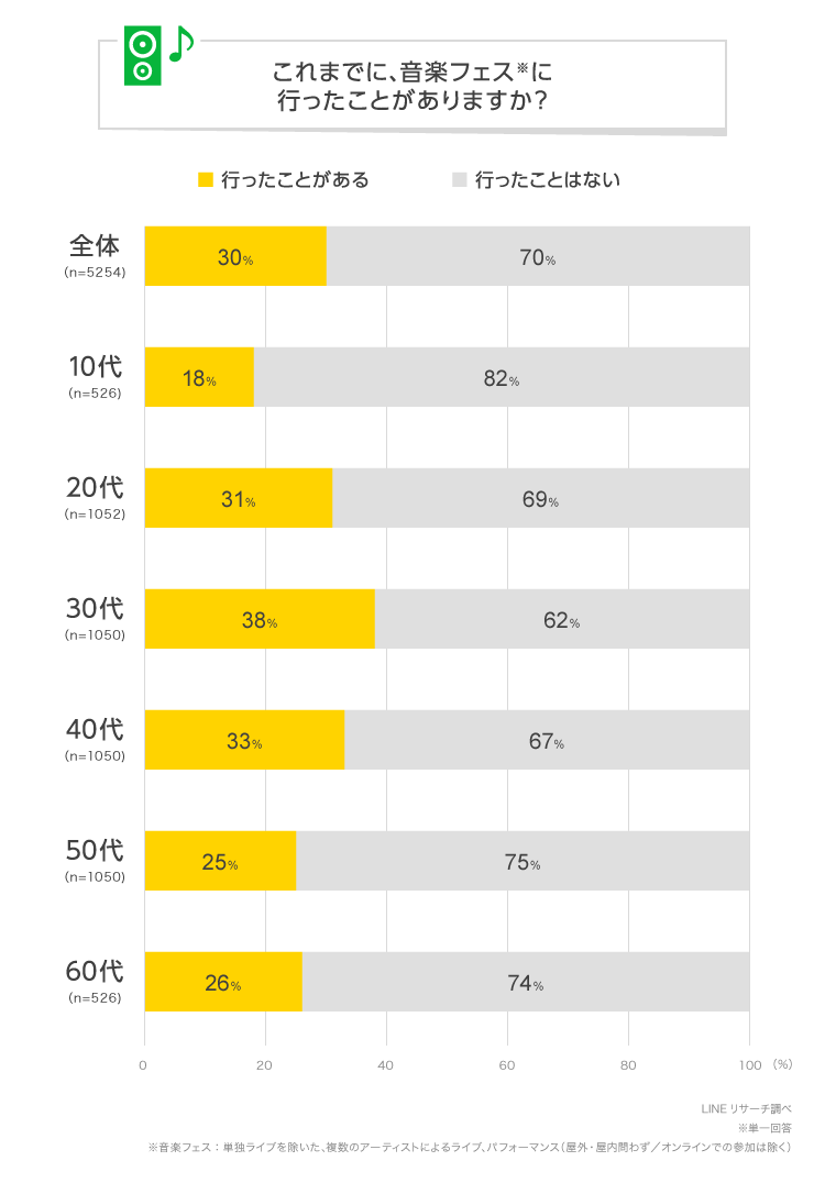 【LINEリサーチ】音楽フェスに「行ったことがある」人は20~40代で高めの割合、特に30代でもっとも高く4割弱という結果に