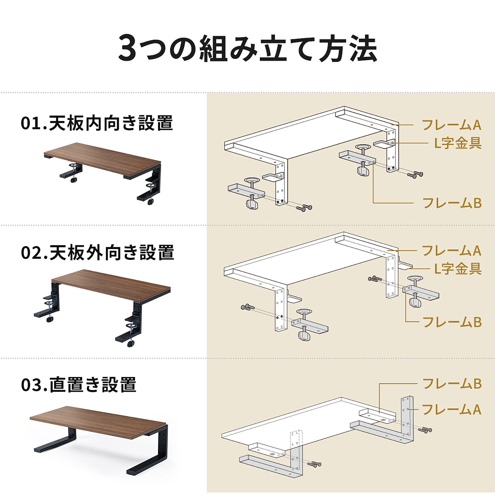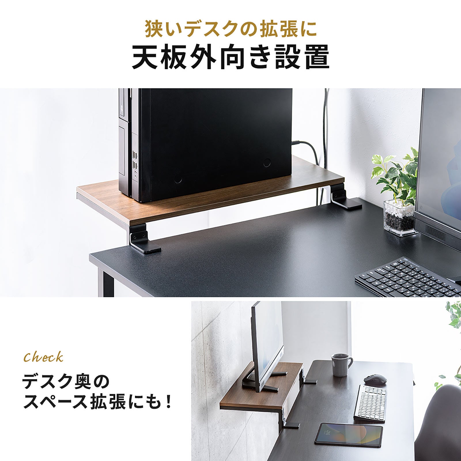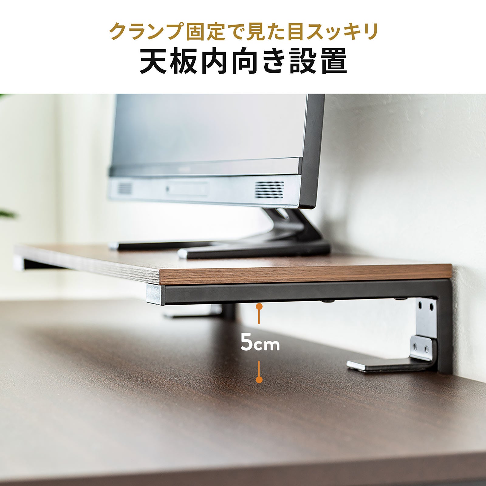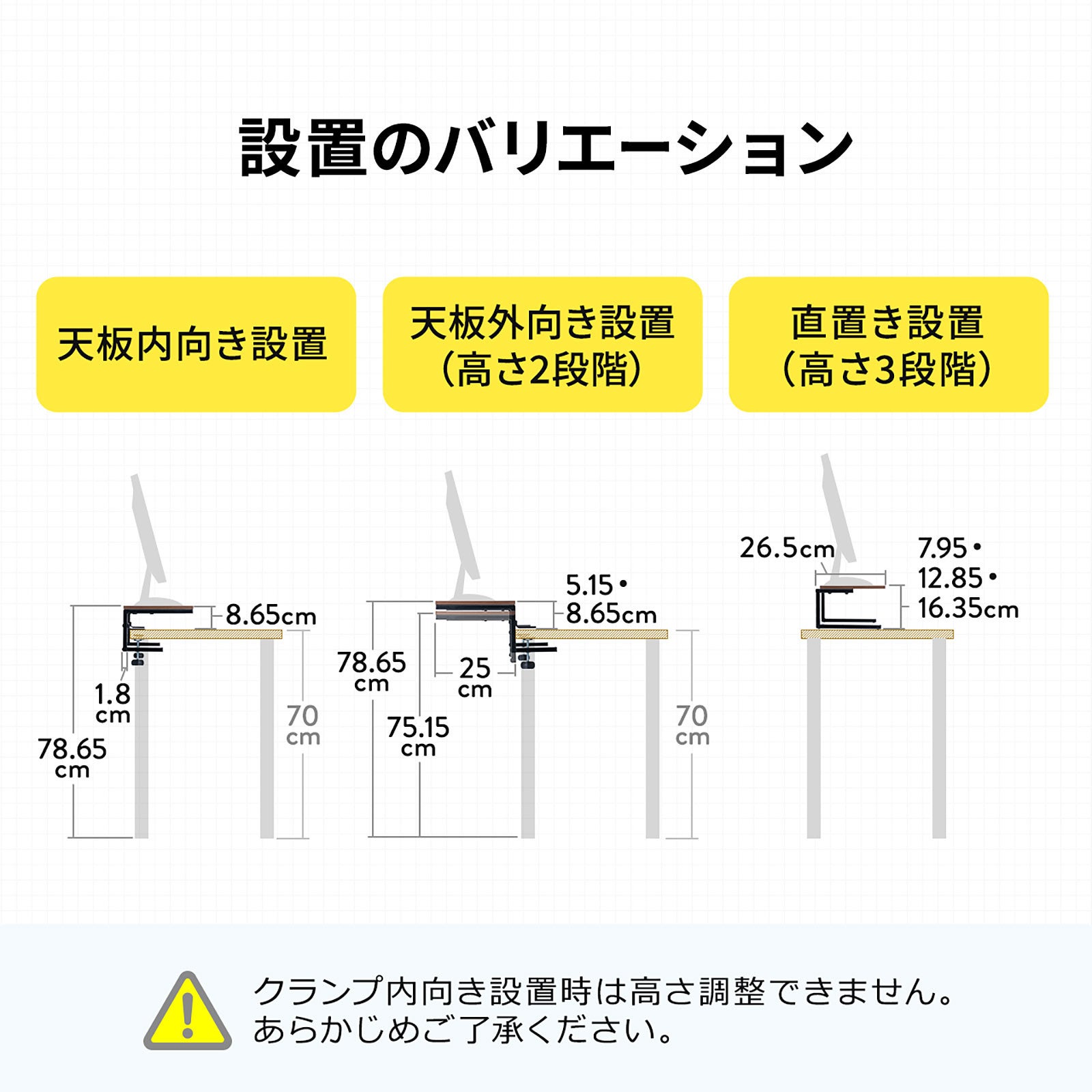 本製品は、クランプ固定(内向き、外向き)、直置きと3WAYで使えるモニター台です。