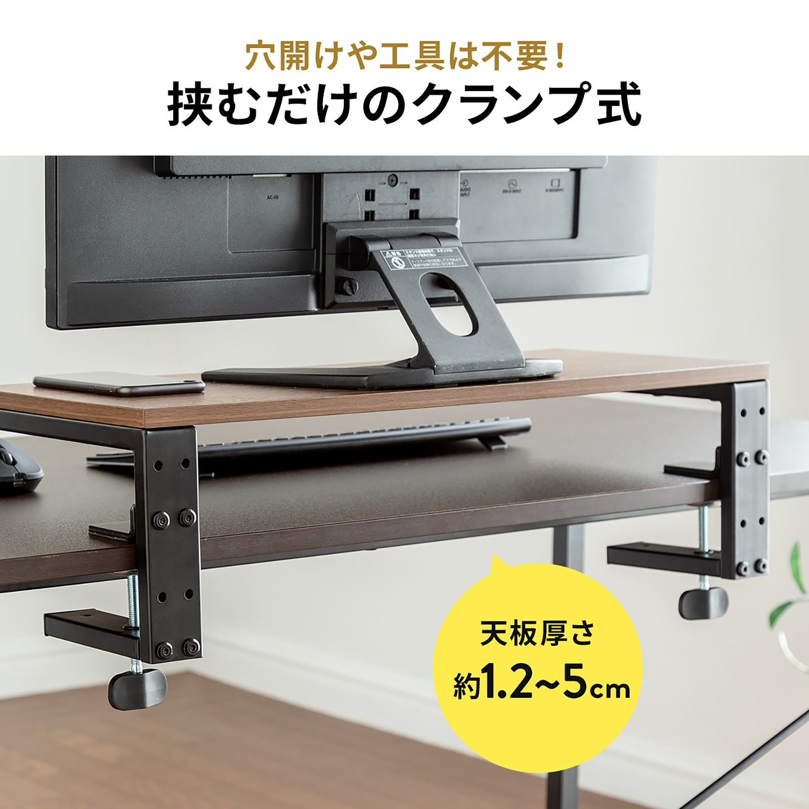 環境や目線に合わせて高さを調整できます。クランプは厚さ約12~50mmまで対応します。