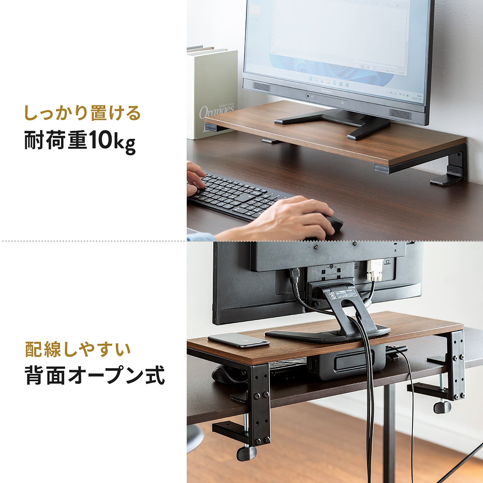 耐荷重は10kgです。背面は配線しやすいオープン式です。