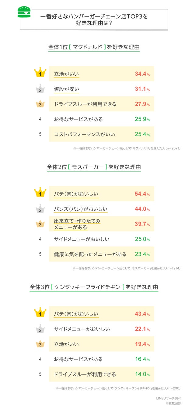 このたびLINEリサーチでは、日本全国の男女を対象に、一番好きなハンバーガーチェーン店や、そのハンバーガーチェーン店を好きな理由について調査しましたので、結果をお知らせいたします。