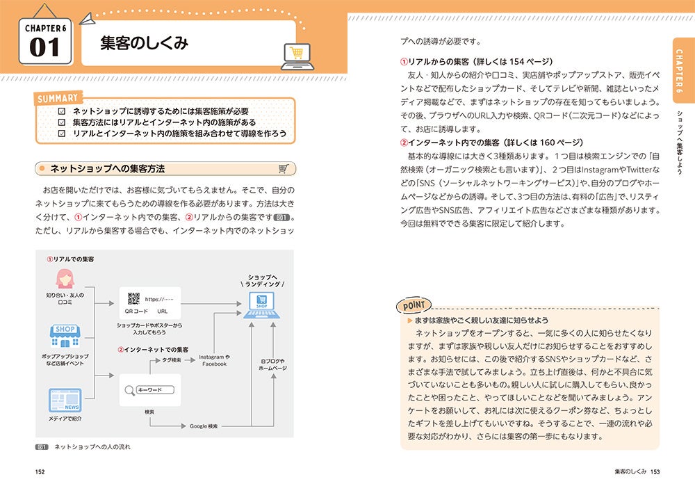 本書では、開設前の準備から、デザインや商品登録などのショップ制作、開店後の運営・集客や改善の流れまで、知っておくべきことを網羅的に扱っています。