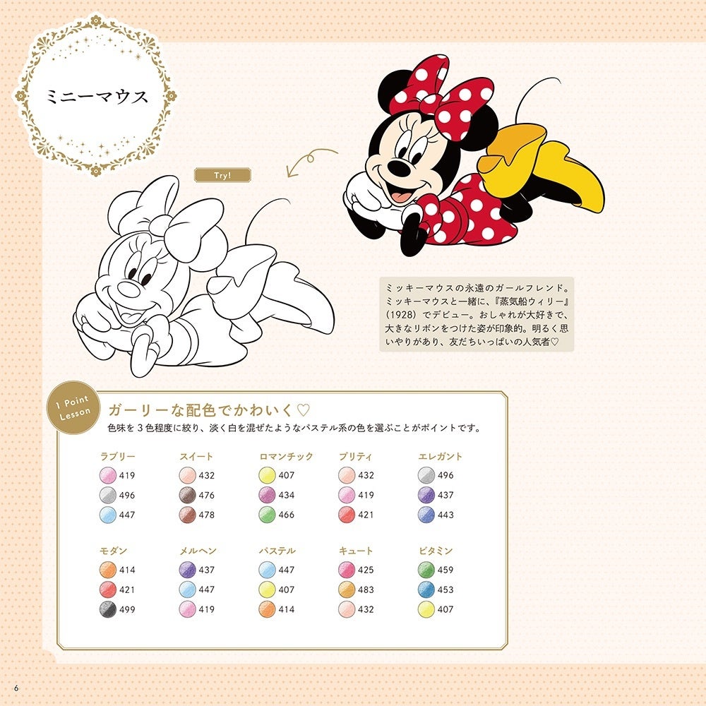 さらに基本の塗り方に加え、ガーリーな配色や質感の描き分け方法といった塗り絵を楽しむためのテクニックを紹介したワンポイントレッスン付き!