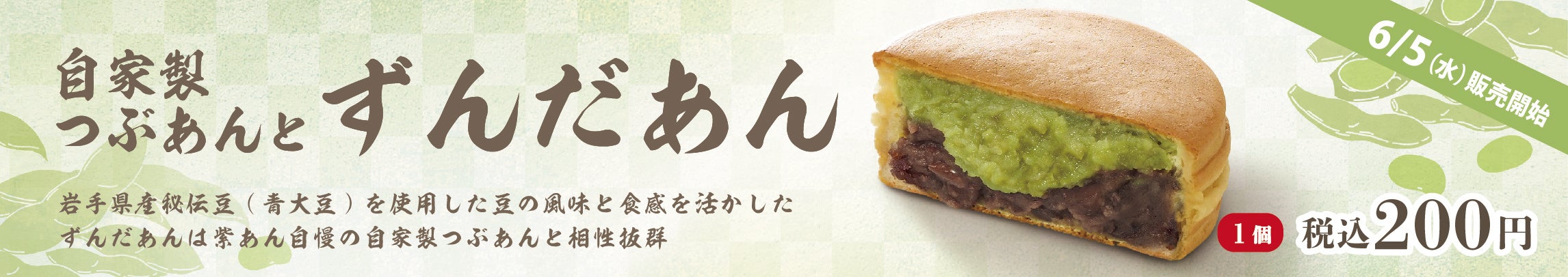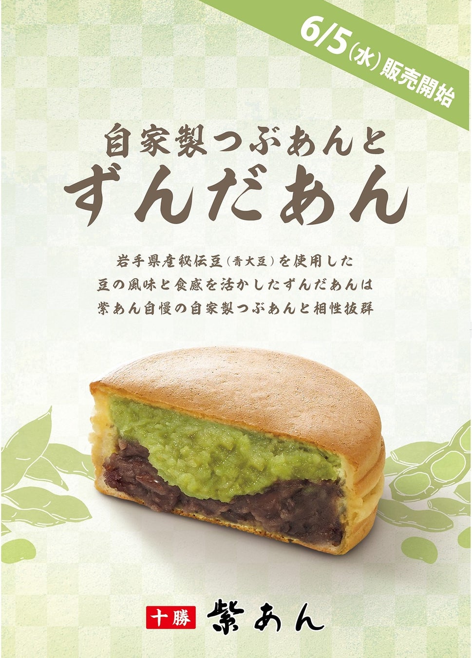 岩手県産秘伝豆の「青大豆」を使用した豆の風味と食感を活かした”ずんだあん”は紫あん自慢の自家製つぶあんと相性抜群
