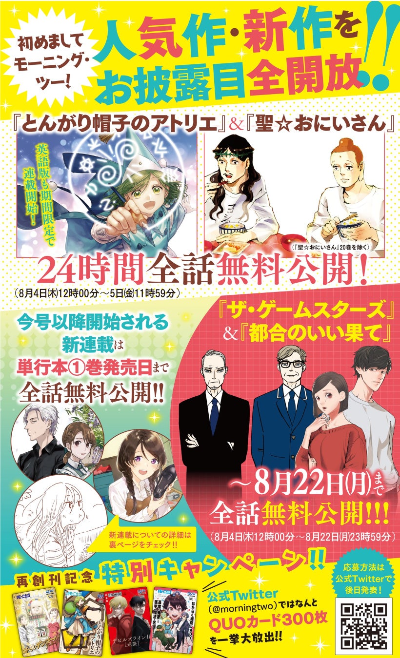 WEB漫画サイト「モーニング・ツー」本日オープン!人気タイトル無料&300名様にQUOカードが当たるTwitterキャンペーン実施