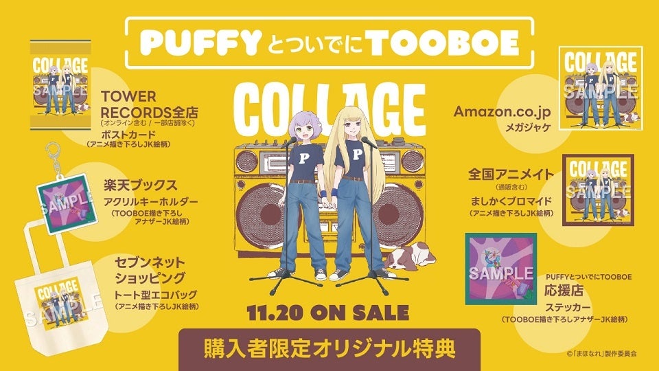 さらに、11月20日にはPUFFYとついでにTOOBOE「コラージュ」のCDがリリース。CDジャケットは、アニメに登場するキャラクター<クルミ=ミライ>と<ユズ=エーデル>が”P”のロゴのTシャツと、オーバーサイズのジーンズを着て、マイクの前に立ち、まるでPUFFYとシンクロしているようなデザインになっており、同絵柄のアクリルスタンドも付属。CDには「コラージュ」をTOOBOEがアレンジ、歌唱している「コラージュ TOOBOE ver.」も収録しているので要注目だ。